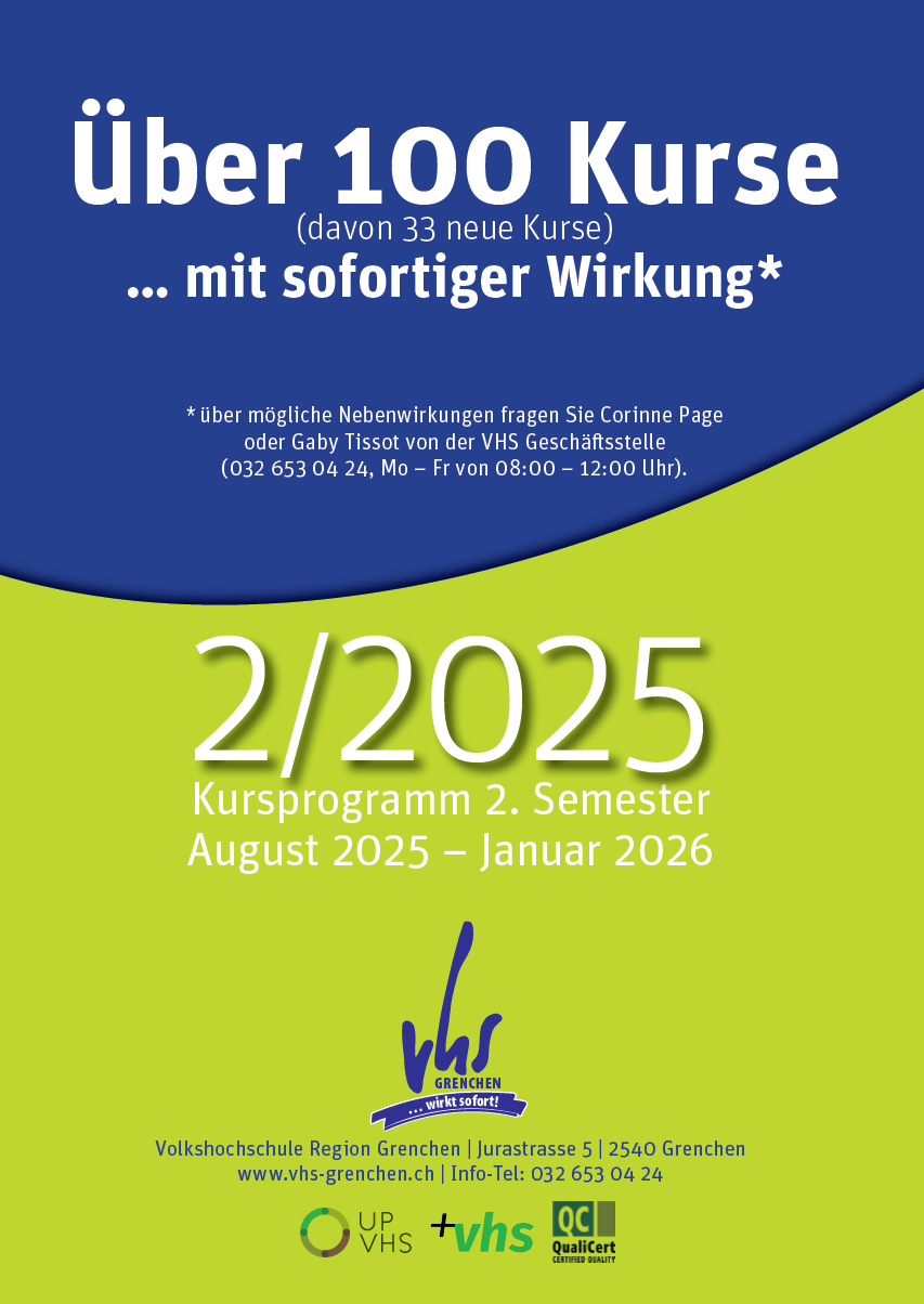 Ab sofort finden Sie die neuen Kurse des zweiten Semesters 2025 auf unserer Homepage. Wir freuen uns auf Ihr Interesse an den Angeboten und sind bei Fragen gerne für Sie da.